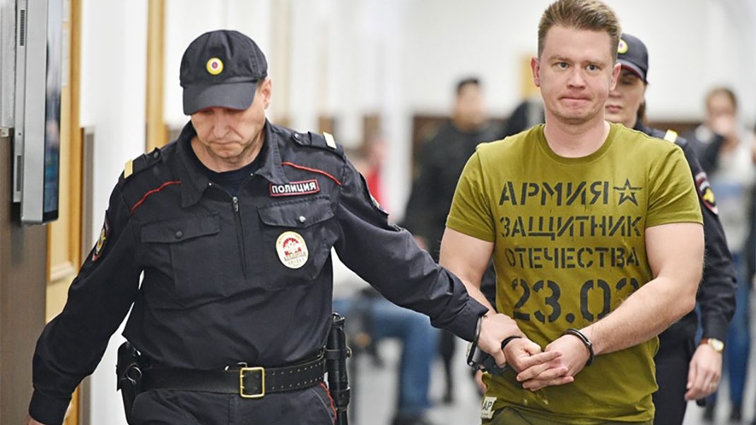 Бывшие сотрудники 2-го отдела «банковского» управления «К» ФСБ России Дмитрий Фролов и Андрей Васильев (на фото), обвиняемые по ч. 4 ст. 159 УК (мошенничество, совершенное организованной группой в особо крупном размере), в Басманном районном суде в апреле 2019 года. Фото: Петр Кассин/Коммерсант