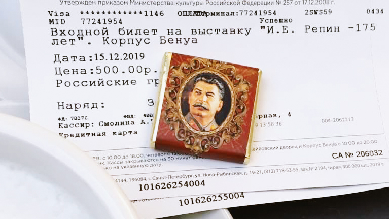 16 декабря посетитель Русского музея в Санкт-Петербурге Вадим Фиалко на своей странице в Facebook рассказал, что в кафе Русского музея на десерт к кофе ему подали шоколад в обёртке с портретом Иосифа Сталина.