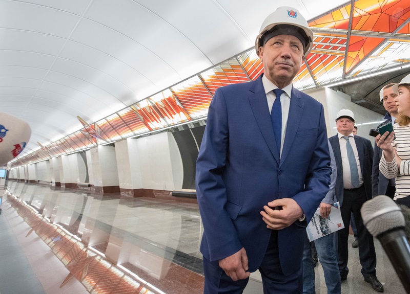 Врио губернатора Санкт-Петербурга пришёл открывать станции метро в каске, потому что они оказались не готовы принять пассажиров. Фото: Евгений Павленко/Коммерсантъ